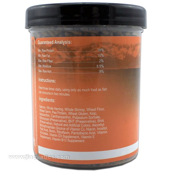 Salmon Whole Herring Wheat Flour Wheat Gluten Fresh Kelp Peas Astaxanthin Lecithin Garlic Spirulina Vitamin C Vitamin E Supplement Niacin Riboflavin Vitamin A Acetate Vitamin D3 Supplement Biotin Vitamin B12 Supplement Folic Acid Manganese Sulfate Zinc Sulfate Ferrous Sulfate Cobalt Sulfate Copper Sulfate Calcium Iodate Ethylenediamine Dihydroiodide